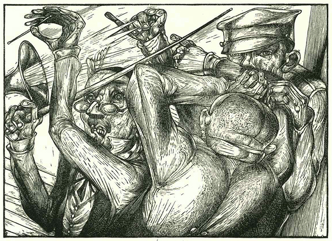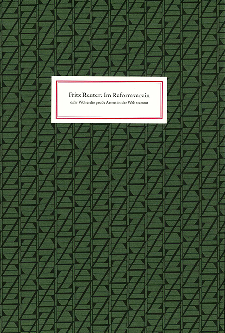 Hirsch – Reuter, Fritz, Im Reformverein oder Woher die große Armut in der Welt stammt. Ein Kapitel aus ‚Ut mine Stromtid‘. Mit vier Orig.-Holzstichen von Karl-Georg Hirsch. Neu-Isenburg 1991. 20 x 30 cm. 25, (5) S., gemusterte OBrosch. mit mont. Deckelschild. Verlagsfrisches Exemplar. Kästner A.77.1. * 64. Druck der Edition Tiessen. Eins von 225 (ges. 300) nummer. Exemplaren der Normalausgabe. Druckvermerk von Hirsch signiert. – Handsatz aus der Original-Janson-Antiqua, gedruckt auf Lana Royal-Bütten.