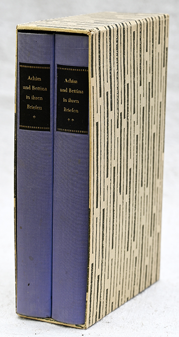 Arnim – Achim und Bettina in ihren Briefen. Briefwechsel Achim von Arnim und Bettina Brentano. Hrsg. von Werner Vordtriede. Einleitung (61 S.) von R.A. Schröder. Zwei Bände. Frankfurt, Suhrkamp 1961. LXVI, (2), 985, (5) S., 1 gefalt. Stammtafel, OLwdbde. mit goldgepr. Rsch. (Rücken etw. verblaßt). Sonst tadelloses Exemplar im Schmuckschuber. Beiliegt eine ausführl. Rezension dieser Ausgabe. EA WG² 180 (Schröder). Hagen 6. * „Enthält meist unveröffentlichte Briefe (…) Essayistische Einleitung mit detaillierter Schilderung der Vorfahren, Geschwister, Biogr. der Briefpartner; Charakter des Briefwechsels.“ (Hagen)