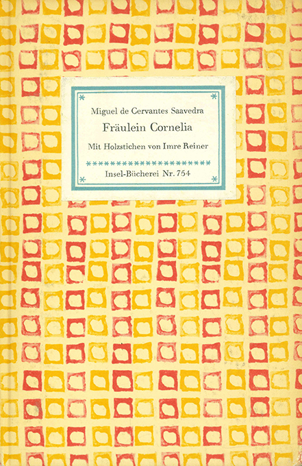 Reiner – Cervantes Saavedra, Miguel de, Fräulein Cornelia. Mit sieben Holzstichen von Imre Reiner. (= Insel-Bücherei 754). Leipzig, Insel 1962. Kl.-8°. 64, (4) S., OPp. mit dreifarb. gemustertem Überzugspapier (Jenne 298). Rücken u. Schnitt etw. nachgedunkelt, sonst gut erhalten. 1. Auflage. Tiessen 22. Kästner 754.