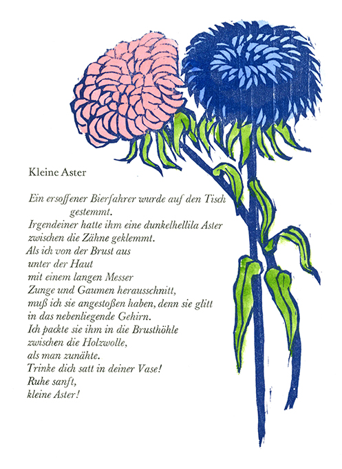 Felixmüller – Rübe, Werner, Benn’s Garten. Ein Essay. Mit elf Orig-Holzschnitten von Conrad Felixmüller, meist zu Versen Gottfried Benns. Kransberg 1976. 18 x 23,5 cm. 1 Bl., (24) einseit. bedr. Bl., 1 Bl., hellgrüner OBüttenpappbd. mit Holzschnitt-Vignetten auf beiden Deckeln u. unbedr. Pergamentpapierumschlag (nur dieser etw. nachgedunkelt u. mit Randläsuren). Das Buch ansich in makellosem Zustand. EA. Söhn 700 M (700-710). Spindler 70.24. * Erstes Buch der Edition Frankfurt in der Petri Presse. Eins von 100 (ges. 185 einschl. Mitarbeiterex.) nummer. Exemplaren der Normalausgabe, im Druckvermerk von Felixmüller mit Tinte signiert. Die – selbstverständlich von den Stöcken gedruckten – Holzschnitte wurden teils farbig gedruckt, teils von Conrad Felixmüller, Londa und Enkelin Sybille handkoloriert. Der Text des Sammlers und Benn-Sachkenners Prof. Werner Rübe über das Verhältnis Gottfried Benns zu Blumennamen wurde aus der Baskerville Antiqua u. Kursiv von Fritz Barkowsky von Hand gesetzt u. auf kräftiges BFK Rives-Bütten abgezogen.