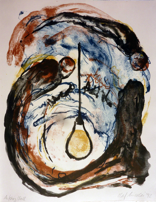 Sisyphos-Presse – Hilbig, Wolfgang, Die Kunde von den Bäumen. Nachwort von Elmar Faber. Mit 6 farb. Orig.-Lithographien von Olaf Nicolai. Berlin 1992. 35 x 42,5 cm. 60, (4) S., OLwd. Tadelloses Exemplar im (an den Rändern teils etw. verblaßten) Schuber. * 7. Druck der Sisyphos-Presse. Eins von 300 numer. Exemplaren. Alle Graphiken vom Künstler betitelt, signiert u. datiert. Der Druck wurde aus der Walbaum-Antiqua von Hand gesetzt u. auf Bugra-Bütten gedruckt, Abzug der Lithographien auf Hahnemühle-Bütten antik.