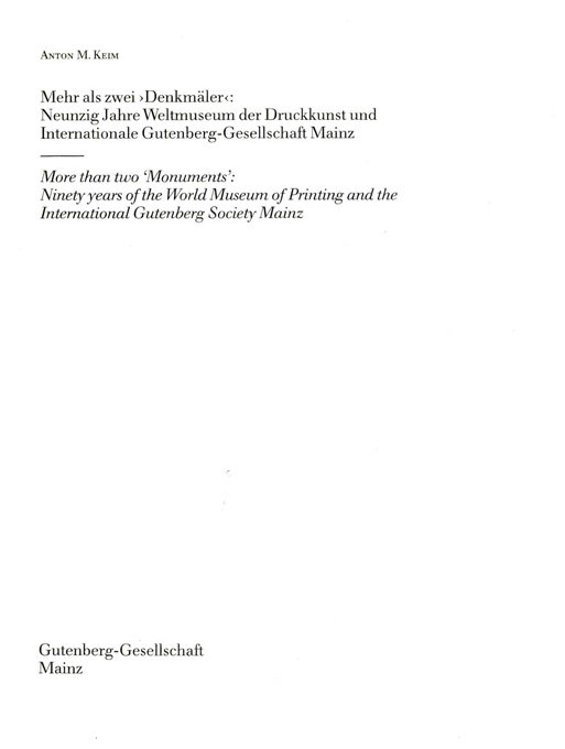 Druckkunst – Keim, Anton M., Mehr als zwei ‚Denkmäler‘: Neunzig Jahre Weltmuseum der Druckkunst und Internationale Gutenberg-Gesellschaft Mainz. Text deutsch u. englisch. (= Kleiner Druck der Gutenberg-Gesellschaft 109). Mainz 1991. Gr.-8°. 48 S. mit 20 Abbildungen, OBrosch. Gutes Exemplar.