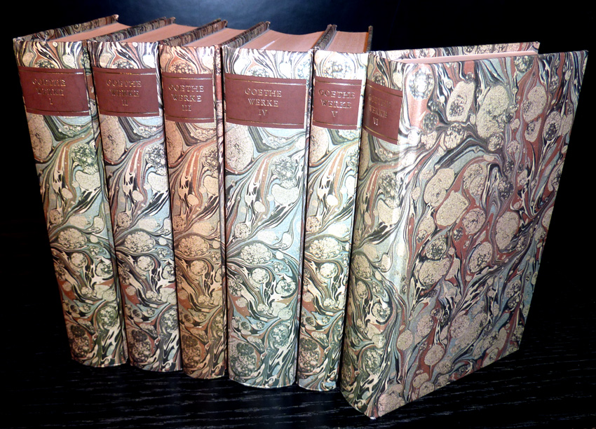 Goethe, Johann Wolfgang, Werke. Sechs Bände. Frankfurt, Insel 1981. Kl.-8°. Zus. 2592 S., marmor. OPappbde. mit goldgepr. Rückentiteln (ein Band farblich etw. abweichend). Gut erhaltene Reihe. * I. Gedichte. West-östlicher Divan. II. Die Leiden des jungen Werther. Die Wahlverwandtschaften. III. Wilhelm Meisters Lehrjahre, 1. Teil. IV. Wilhelm Meisters Lehrjahre, 2. Teil. Hermann und Dorothea. Das Märchen. V. Iphigenie auf Tauris. Egmont. Torquato Tasso. VI. Faust I. Faust II.