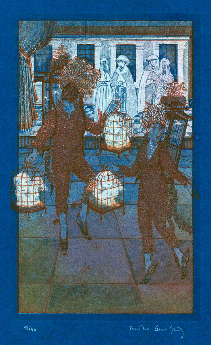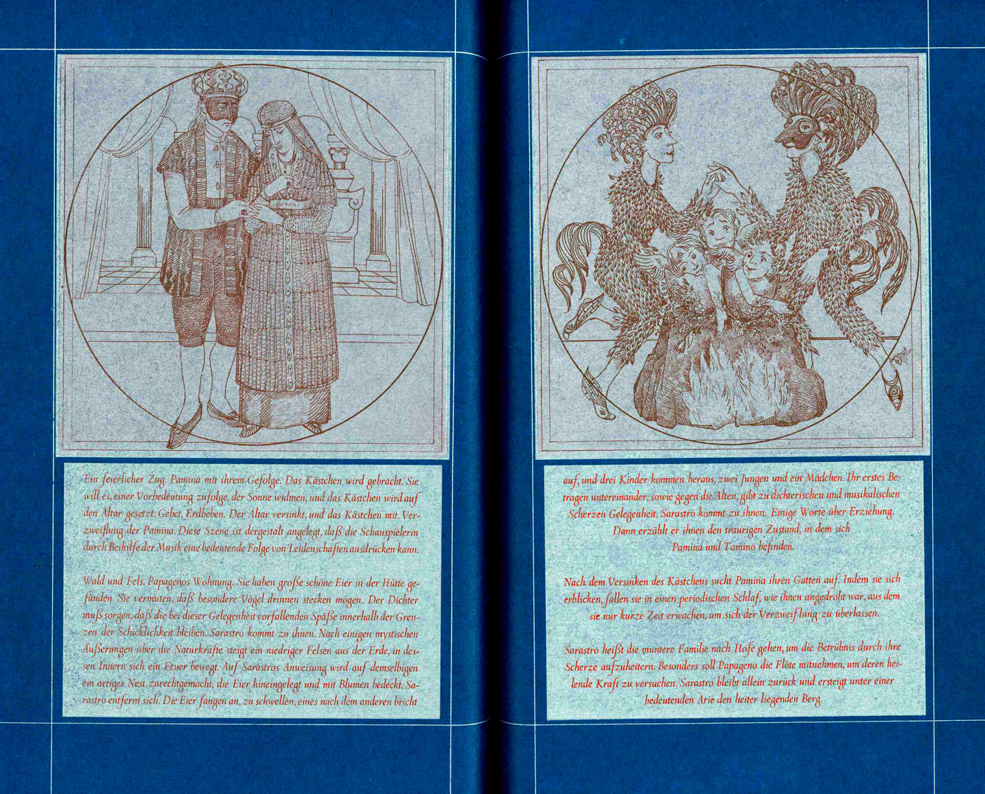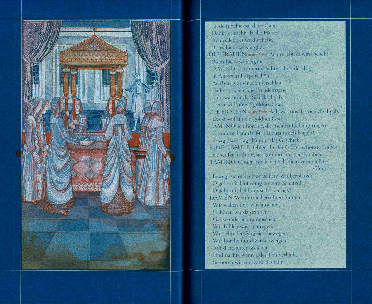 Raamin-Presse – Goethe, Johann Wolfgang von, Der Zauberflöte zweiter Teil. Fragment. Mit zehn Bildern von Roswitha Quadflieg. Hamburg 1983. 19,5 x 30,5 cm. (50 S.), OKalblederband (Rücken wie meist minimal nachgedunkelt). Sonst tadelloses Exemplar im Schuber. Tiessen 20. Spindler 71.14. 20 Jahre Raamin-Presse S. 120 – 129. * 14. Druck der Raamin-Presse. Eins von 40 (ges. 155) nummerierten Exemplaren der Vorzugsausgabe mit einem zusätzlichen, lose beigefügten Abzug der siebten Graphik, von Quadflieg nummeriert u. signiert. Der Druck des Buches ebenfalls mit Signatur der Künstlerin. – Aus der Cancelleresca Bastarda gesetzt u. in Rot u. Negativ-Silber gedruckt. Die Radierungen farbig, davon 8 über zweifarbigen Kunstharzstichen. Gedruckt auf blauem Mingei-Japanpapier. – Meines Erachtens der schönste, in jedem Fall der aufwändigste Pressendruck von Roswitha Quadflieg.