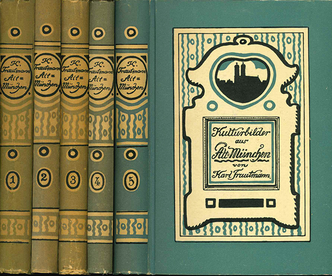Trautmann, Karl, Kulturbilder aus Alt-München. Mit Illustrationen von Hermann Stockmann. Fünf Bände. München, Lindauer 1918 – 1930. Zus. 996 S. + 94 Tafeln, hübsche OPappbde. (Stockmann). Die Einbände wie meist stellenw. verblaßt bzw. nachgedunkelt, etw. berieben u. bestoßen. Insges. gut erhaltene Reihe. Die Bde. I u. II liegen in 2. Auflage vor, die Bde. III – V in EA. * Aus dem Inhalt: Altmünchener Häuser; Theatererinnerungen; Frater Michaels Merkbüchlein; Kurfürst Maximilian der Erste von Bayern als Kunstfreund; Der alte Gallmayr am Rindermarkt und seine tapfere Leni; Die Amalienburg im Nymphenburger Schloßgarten; Ein Künstlerleben im Dienste Alt-Münchens; Aus der Geschichte eines Alt-Münchener Bürger- und Geschäftshauses.