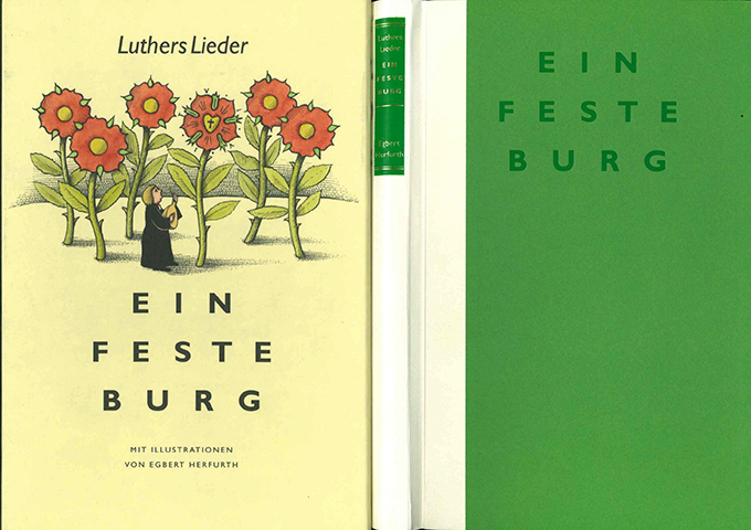 Herfurth – Luther, Martin – Ein feste Burg. Luthers Lieder. Hrsg. von Reinhard Mawick. Einführung von Inge Mager. Mit Liedtexten und Noten sowie zahlr. farbigen Illustrationen von Egbert Herfurth. Leipzig, Faber & Faber u. Frankfurt, Edition chrismon 2008. 4°. 139, (3) S., OHpgmt. in farb. illustr. Schmuckschuber (dieser etw. fleckig). Sonst tadelloses Exemplar. 1. Auflage. * Eins von 300 Exemplaren der Vorzugsausgabe in Halbpergament mit goldgepr. Lederrückenschild. – Titelblatt mit einer eigenhänd. Widmung des Künstlers an den Leipziger Antiquar Dieter Bührnheim.