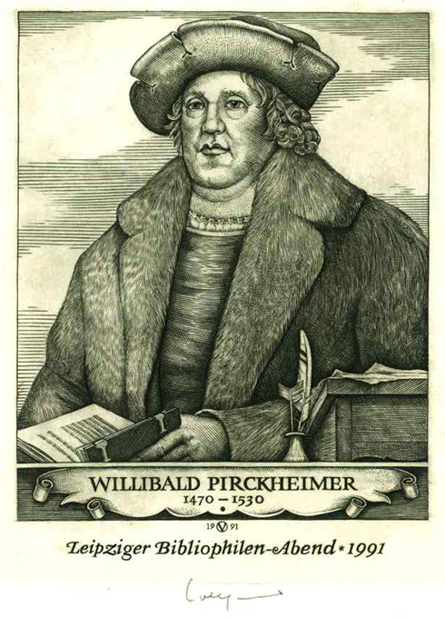 Pirckheimer-Gesellschaft – Kästner, Herbert (Hg.), Fünfunddreißig Jahre Bibliophilie in Leipzig. Die Leipziger Gruppe der Pirckheimer-Gesellschaft von 1956 bis 1991. Leipzig 1991. 63 S., OPp. mit goldgepr. Deckeltitel. Tadelloses Exemplar im Schuber. * Eins von 35 (ges. 200) nummer. Exemplaren der Vorzugsausgabe B mit einem beilieg. Orig.-Kupferstich von Oswin Volkamer (Portrait Willibald Pirckheimer; Plattengr. 8,2 x 10,4 cm, Blattgr. 13 x 21 cm), auf Bütten gedruckt u. signiert. – Aus der Bembo-Antiqua gesetzt u. auf Werkdruckpapier gedruckt. Gesamtgestaltung von Gert Wunderlich. – Beiträge zur Pirckheimer-Gesellschaft, der Neugründung des Leipziger Bibliophilen-Abends u. Publikationsreihen.