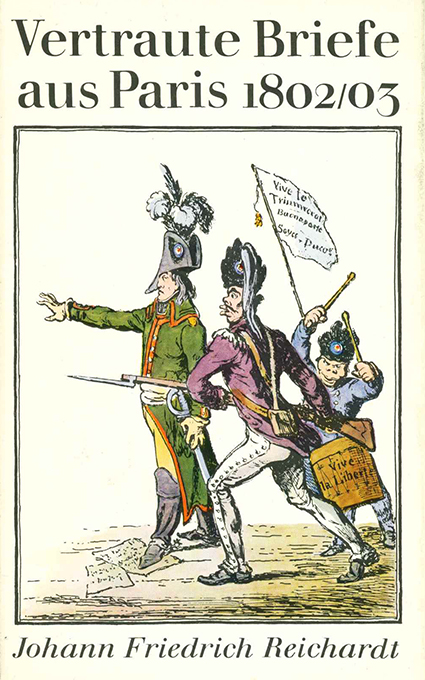 Reichardt, Johann Friedrich, Vertraute Briefe aus Paris 1802/1803. Hrsg. u. Einleitung von Rolf Weber. Berlin, Verlag der Nation 1981. 341, (3) S. mit Abbildungen im Text + 32 Tafeln, OLwd. mit farb. illustr. OUmschl. 1. Auflage. Gutes Exemplar, Folgeband der ein Jahr zuvor ersch. Vertrauten Briefe aus Paris 1792.