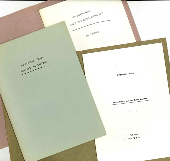 Huber, Margaretha, Drei seltene Privatdrucke / Vorträge. Rom, (Selbstverlag der Autorin) 1989 – 1990. Zus. 72 S., OBroschuren (stellenw. minim. nachgedunkelt bzw. verblasst). Sonst tadellos. EA. * In äußerst kleiner Stückzahl als Manuskripte veröffentlicht, teils deutlich vor den ersten öffentlichen Publikationen. – 1) Bewegte Gegensätze. Vortrag, gehalten im Rahmen einer Ringvorlesung an der FU Berlin. 2) Deutschland, aus der Ferne gesehen. 3) Über das Revolutionäre. Vortrag für die Berliner Tagung der Internationalen Assoziation von Philosophinnen.