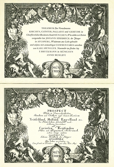 München (Ansichten) – Spengler, Karl, Theatrum Der Vornehmsten Kirchen, Clöster, Pallaest und Gebeude in Churfürstlicher Residentz Stadt München, Wie solche vor Zeiten vorgestellt hat Johann Stridbeck der Jünger in Augspurg, Wiederum ans Licht gebracht und anjezo mit anmuthigen Commentariis versehen. Zwei Bände (Textband + Bildband). München, Bruckmann 1966. 29 x 20,5 cm (quer). 51, (5) S. mit Abbildungen Texte u. Erläuterungen + (32 S.) mit 16 ganzseit. Wiedergaben der Kupferstiche Johann Stridbecks, illustr. OPappbde. (die Rücken minim. nachgedunkelt u. mit einer Läsur). Sonst gut erhaltene Bände im illustr. Schmuckschuber. EA.