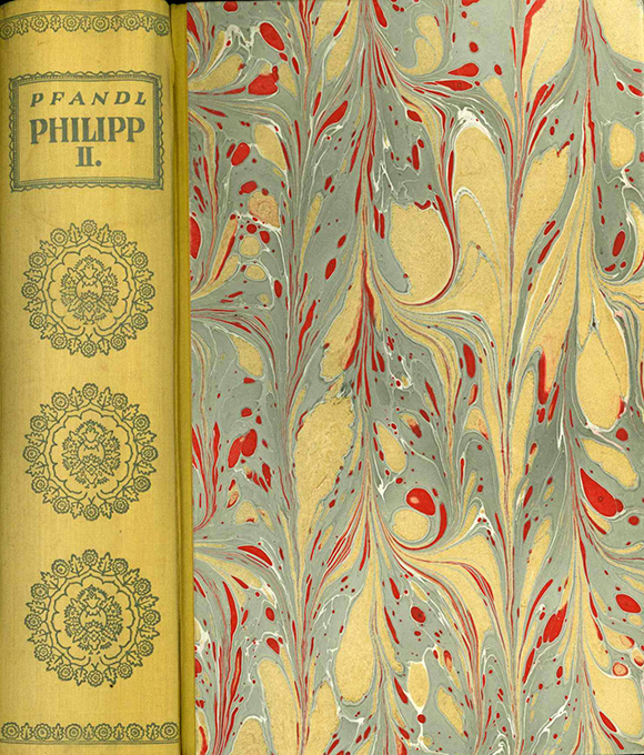 Philipp II. – Pfandl, Ludwig, Philipp II. Gemälde eines Lebens und einer Zeit. München, Callwey (um 1942). 26.-35. Tsd. Gr.-8°. 562, (10) S. + 13 Tafeln, späterer Halbleinenbd. unter Verwendung des Orig.-Rückens (dieser nur minim. verblasst). u. handmarmor. Überzugspapier. Insges. sehr gutes Exemplar im hübschen, individuellen Handeinband.