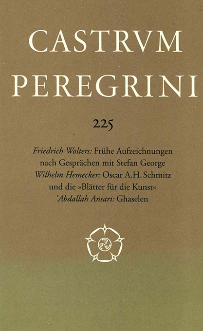 George – Wolters, Friedrich, Frühe Aufzeichnungen nach Gesprächen mit Stefan George zur „Blättergeschichte“. Mit einer Einleitung hrsg. von Michael Philipp. S. 5 – 61 in: Castrum Peregrini 225. Amsterdam 1996. Gr.-8°. 124, (16) S., OBrosch. (stellenw. verblasst). Sonst sehr gutes Exemplar. EA. * Nummeriertes Exemplar einer kleinen Auflage. – Weit. Beitr. über Oscar A.H. Schmitz u. die „Blätter für die Kunst“, Gedichte von Ruud van Weerdenburg, Kurt Mejstrik, Gisela Wendt, Manuel Claussner u.a.