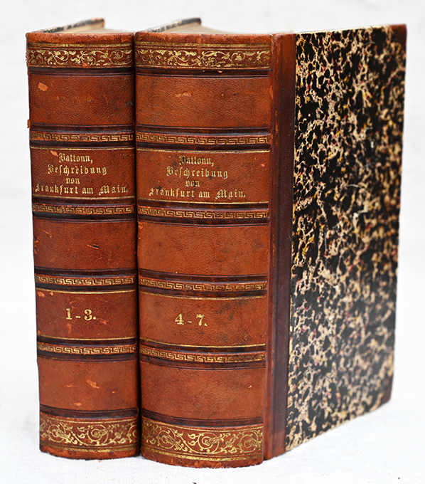 Frankfurt – Battonn, Johann Georg, Oertliche Beschreibung der Stadt Frankfurt am Main. Aus dessen Nachlasse hrsg. von dem Vereine für Geschichte und Alterthumskunde zu Frankfurt a.M. durch den zeitigen Director desselben L. H. Euler. 7 Hefte in 2 Bänden (vollständig). Frankfurt, Verlag des Vereins 1861 – 1875. Zus. 2228 S. + 2 Kupferstichtafeln auf kräftigem Karton (Portaits: J.G. Battonn, Lippold pinx. 1764; Johann Carl von Fichard, Rössler pinx. Roma 1804; beide gest. von Eissenhardt), dekorative Halblederbde. mit goldgepr. Rücken u. marmor. Überzugspapieren (die Rücken nur minimal ausgeblichen u. berieben, Innengelenke von Bd. I. geringfügig gelockert, Vorsätze u. die anliegenden Bl. stellenw. leimschattig). Nur wenige Bl. etw. braunfleckig, die Kupferstiche in bestmöglichem Zustand. Insgesamt sehr gut erhaltene, vollständige Ausgabe dieser substanziellen Bestandsaufnahme der Stadt, der Straßen und Bauwerke, zudem in hübschen Originaleinbänden der Zeit. EA. * I. Geschichtliche Einleitung. II.Beschreibung der Altstadt und zwar des östlichen und nördlichen Theils der Oberstadt. III. Beschreibung der Altstadt und zwar des südlichen und westlichen Theils der Oberstadt. IV. Beschreibung der Altstadt und zwar des letzten Theils der Oberstadt und des Anfangs der Niederstadt. V. Beschreibung des Schlusses der Altstadt und des Anfangs der Neustadt. VI. Beschreibung des übrigen Theils der Neustadt. VII. Beschreibung von Sachsenhausen. General-Register.