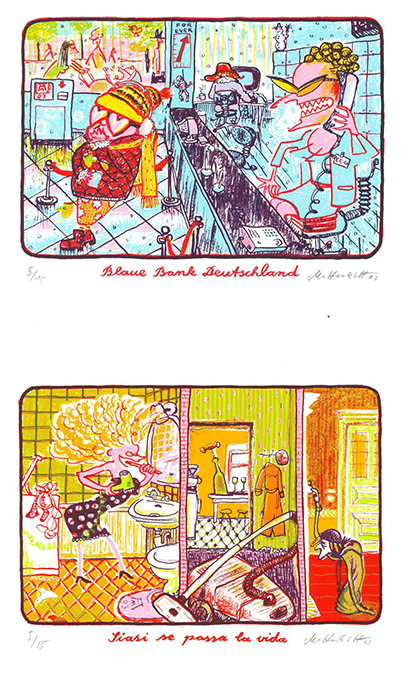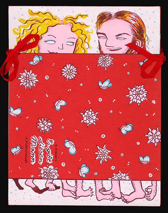 Junge Illustratoren – Mattenklott – Kaleri, Anna, Es gibt diesen Mann. 10 Illustrationen von Anja Mattenklott. Leipzig, Privatdruck 2003. Ca. 19 x 25 cm, Textheft ca. 10,5 x 10 cm. Farb. illustr. Titelbl., 10 farbige Graphikbl., Impressum mit Vignette, 22 S. Begleitheft „die Texte“, farb. illustr. Kartonmappe mit 2 textilen Schließbändern. Tadelloses Exemplar. Sehr selten. EA. * Eins von nur 15 Exemplaren, alle 10 Graphiken nummeriert, signiert u. datiert. Bei allen Graphiken, dem Umschlag des Begleithefts u. der Mappe handelt es sich um Orig.-Farbsiebdrucke. – Anja Mattenklott (* 1975) studierte zunächst indische Kunstgeschichte u. Philologie, dann Malerei u. Graphik an der HGB Leipzig. Bei dieser Graphikmappe handelt es sich um ein besonders frühes Werk der Künstlerin.