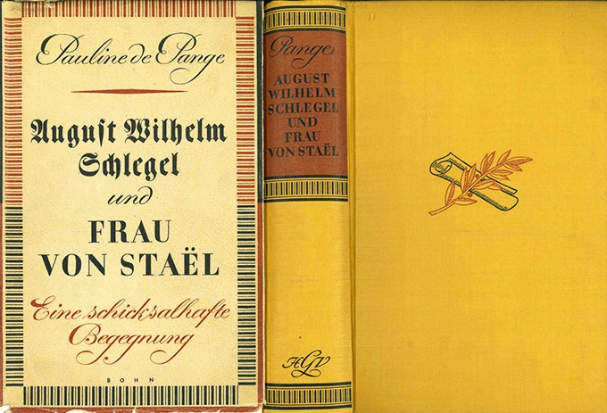 Schlegel – Pange, Pauline Gräfin de, August Wilhelm Schlegel und Frau von Staël. Eine schicksalhafte Begegnung. Nach unveröffentlichten Briefen erzählt. Hamburg, Goverts (Cop. 1940; 5.-7. Tsd.) Gr.-8°. 496 S. mit Titelportrait u. 2 Stammtafeln, OLwd. mit OUmschl. (dieser nachgedunkelt u. mit Läsuren). Das Buch ansich sehr gut erhalten.