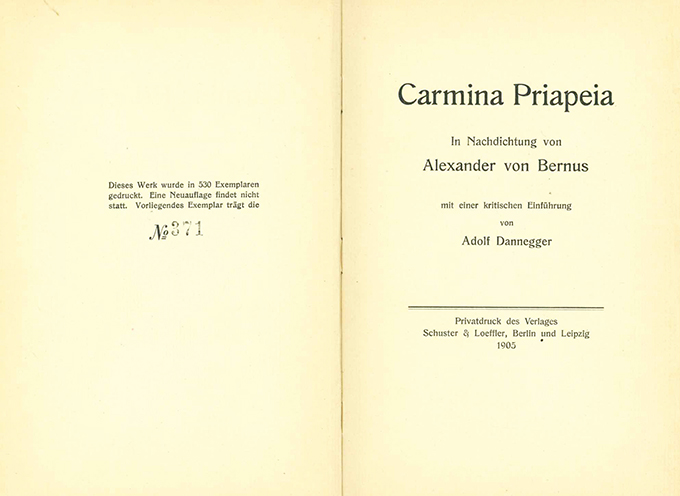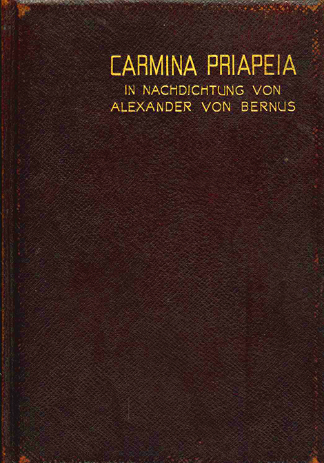 Erotica – Carmina Priapeia. In Nachdichtung von Alexander von Bernus mit einer kritischen Einführung von Adolf Dannegger. Berlin u. Leipzig, Privatdruck des Verlages Schuster & Loeffler 1905. XVI, 91 S., geprägter OGanzlederbd. mit goldgepr. Deckel- u. Rückentitel u. Kopfgoldschnitt (stellenw. berieben bzw. beschabt, Rücken etw. ausgebleicht). Sonst / innen sehr gut erhalten, unbeschnittenes Exemplar auf Bütten. EA WG² 4 (Bernus). Hayn-Gotendorf VI. 295. * Eins von 530 nummer. Exemplaren. „Eine Neuauflage findet nicht statt.“ (Colophon) – „Enth. 86 witzreiche erotische Epigramme u. kleinere Gedichte römischer Dichter in gelungenen Nachdichtungen.“ (Hayn-Gotendorf) – „Unsere neue Ausgabe ist nicht nur die erste vollständige, sondern auch die erste künstlerische Übertragung (…) Bernus (…) hat eine köstliche Nachdichtung geschaffen, deren Wirkung noch durch den Reim erhöht ist (…) Natürlich ist das Buch eine Lektüre nur für Männer…“ (Aus dem Verlagsprospekt)
