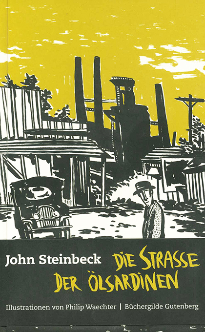Steinbeck, John, Die Straße der Ölsardinen. Roman. Übertr. von Rudolf Frank. Mit sechsundzwanzig (zweifarbigen, teils ganzseit.) Illustrationen von Philip Waechter. Frankfurt u.a., Büchergilde Gutenberg 2009. 250, (6) S., zweifarb. illustr. OPp. Sehr gutes Exemplar mit Bauchbinde. 1. Auflage dieser illustrierten Ausgabe.