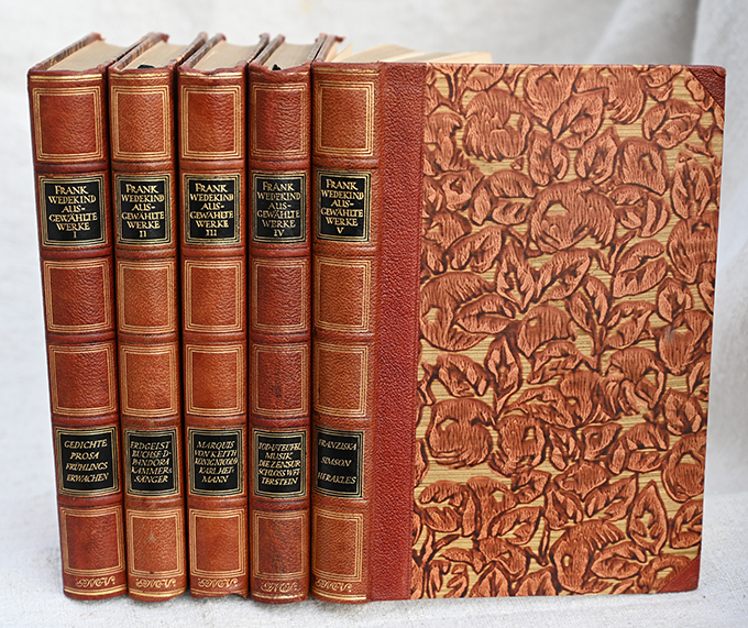 Wedekind, Frank, Ausgewählte Werke in fünf Bänden. Hrsg. von Fritz Strich. München, Georg Müller 1924. Zus. 1592 S., OHalblederbde. mit Rückenverg. u. jeweils 2 goldgepr. Lederrückenschildchen, Kopfgoldschnitte (Entwurf von Paul Renner; nur minim. berieben, Außen- u. Fußschnitte etw. stockfl.) 19 Bl. in Bd. II mit Knickspuren im Randbereich. Insges. gut erhaltene Ausgabe in den dekorativen Vorzugseinbänden. 1. Auflage. * I. Gedichte; Prosa; Frühlings Erwachen. II. Erdgeist; Die Büchse der Pandora; Der Kammersänger. III. Der Marquis von Keith; König Nicolo; Karl Hetmann. IV. Tod und Teufel; Musik; Die Zensur; Schloss Wetterstein. V. Franziska; Simon; Herakles.