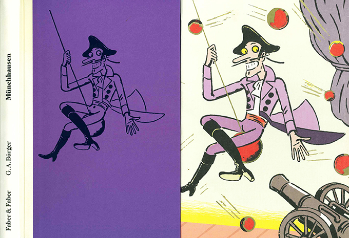 Bürger, Gottfried August, Wunderbare Reisen zu Wasser und zu Lande, Feldzüge und lustige Abenteuer des Freiherrn von Münchhausen, wie er dieselben bei der Flasche im Zirkel seiner Freunde selbst zu erzählen pflegt. Als Theaterspiel illustriert von Thomas M. Müller. Leipzig, Faber & Faber 2020. 17 x 25,5 cm. 156, (4) S. mit zahlr. (überwieg. ganz- oder doppelseit.) farb. Illustrationen, illustr. OHpgmt. Tadelloses Exemplar im farb. illustr. Schmuckschuber. 1. Auflage. * Eins von 200 Exemplaren der Vorzugsausgabe in Halbpergament.
