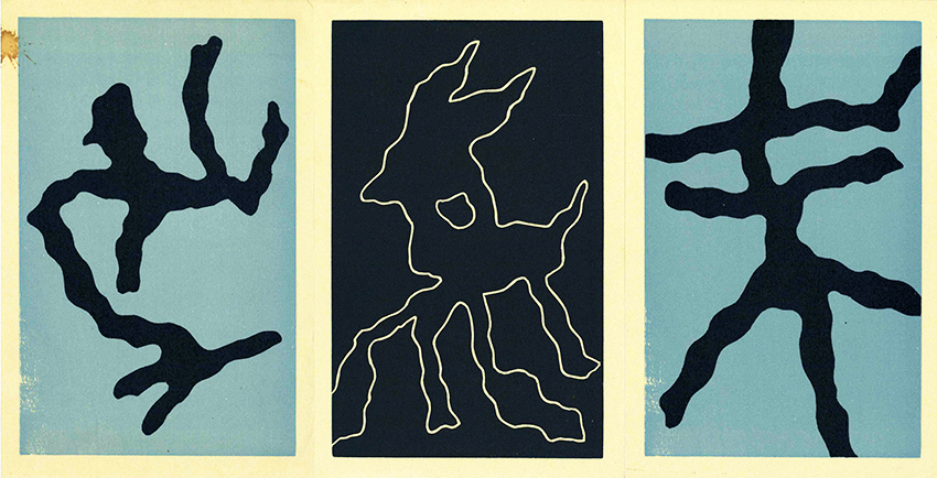 Arp, Hans, Wortträume und schwarze Sterne. Auswahl aus den Gedichten der Jahre 1911 – 1952. Vorwort (″Wegweiser“) von Arp. Mit 3 (statt 4, dafür 1 doppelt) lose beiliegenden Orig.-Holzschnitten. Wiesbaden, Limes 1953. Gr.-8°. 94, (2) S. + 4 Tafeln (Plastiken Arps), illustr. OBrosch. (stellenw. verblasst u. mit Randläsuren) Einer der Holzschnitte mit einem Kaffeefleck im weißen Rand. Sonst gutes, unbeschnittenes Exemplar. Beiliegt ein gedrucktes Kärtchen des Verlags „Mit den besten Empfehlungen“ u. dem maschinenschr. Zusatz „im Auftrag von Frau Arp“. Selten. * Eins von 100 Exemplaren der Vorzugsausgabe, dieses nicht nummeriert u. nicht signiert, da es sich um das Belegstück der Verlegerin Marguerite Schlüter handelt. Mit 1 schwarzweißen u. 2 hellblau-schwarzen Orig.-Holzschnitten, jeweils auf Bütten gedruckt. Ein SW-Holzschnitt fehlt, dafür liegt der andere doppelt bei, insges. also 4 Holzschnitte. – Satz der Texte aus der Bodoni, gedruckt auf feingeripptes Maschinenbütten. Buchgestaltung von Flora Klee-Palyi. Die Vorzugsausgabe ist deutlich größer, als die Normalausgaben.
