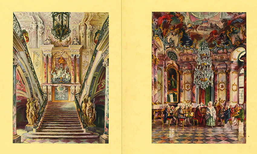 Rokoko – Deutsches Rokoko. Berlin, Reichsbahnzentrale für den Deutschen Reiseverkehr (um 1930). 4°. 9 mont. Farbbilder auf kräftigen Kartonbl., lose in illustr. OKt.-Mappe (etw. angestaubt). Sonst gutes Exemplar. Selten. * Darstellungen aus Schloß Bruchsal, Schloß Wilhelmstal, Schloß Ludwigsburg, Residenz Würzburg, Wieskirche, Amalienburg München u.a.