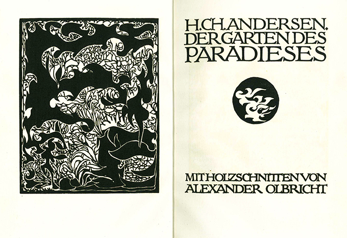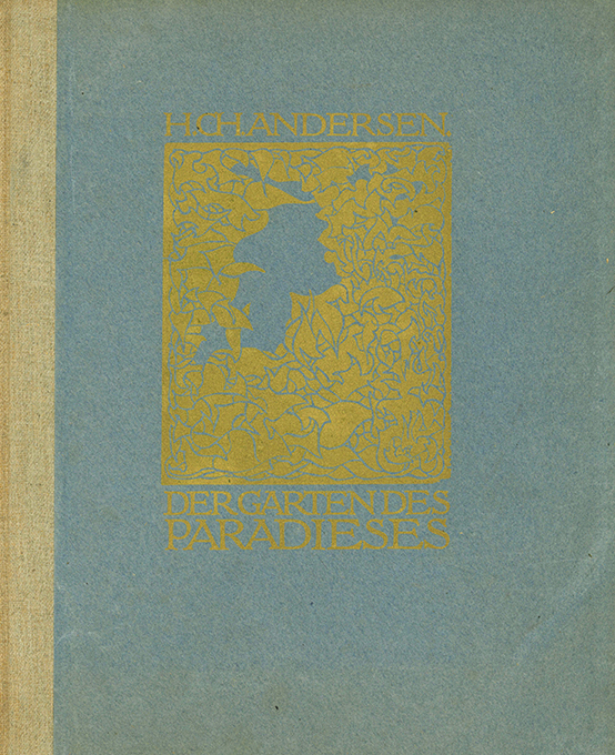 Olbricht – Andersen, H. CH., Der Garten des Paradieses Mit 2 ganzseit. Orig.-Holzschnitten, 1 Titelvignette u. 1 Schmuckrahmen in Holzschnitt von Alexander Olbricht. Berlin, Otto v. Holten 1920. 24 x 29,5 cm. (6), 32, (4) S., OHlwd. mit in Goldbronze gedruckter Deckelillustration u. Vignette auf dem Rückdeckel (stellenw. etwas verblasst). Nahezu tadelloses, innen absolut frisches, unbeschnittenes Exemplar. 1. Auflage. * Eins von 250 (ges. 270, hier nicht nummer.) Exemplaren. Sehr schöner Satz u. Druck, auf Veranlassung Marcus Behmers auf der Handpresse auf dünnes, handgeschöpftes, fast an Japanpapier erinnerndes Bütten gedruckt. Die dekorativen Holzschnitte sind in thematischem Zusammenhang mit zahlreichen Tuschezeichnungen mit Pflanzen- u. Blütenmotiven entstanden, mit denen Olbricht sich über viele Jahre beschäftigt hat.