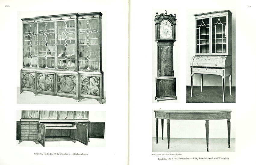 Möbel – Schmitz, Hermann, Das Möbelwerk. Die Möbelformen vom Altertum bis zur Mitte des neunzehnten Jahrhunderts. Tübingen, Wasmuth 1956. 6. Aufl. 4°. LXXX S. Text mit Illustrationen + 320 Tafeln mit insges. 683 Abbildungen, OLwd. mit Goldpr. (stellenw. gering verblasst, etw. gewölbt). Vorsatz mit Stempel eines Antiquitätenhändlers. Insgesamt gutes Exemplar. * Antike, Mittelalter, Renaissance, Barock, Renaissance, Barock, Rokoko, Louis XVI, Frühklassizismus, Empire, Biedermeier, Neurokoko, 19. Jahrhundert, Vorderer Orient u. Ostasien.
