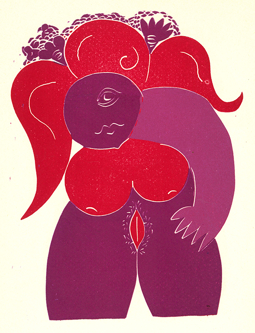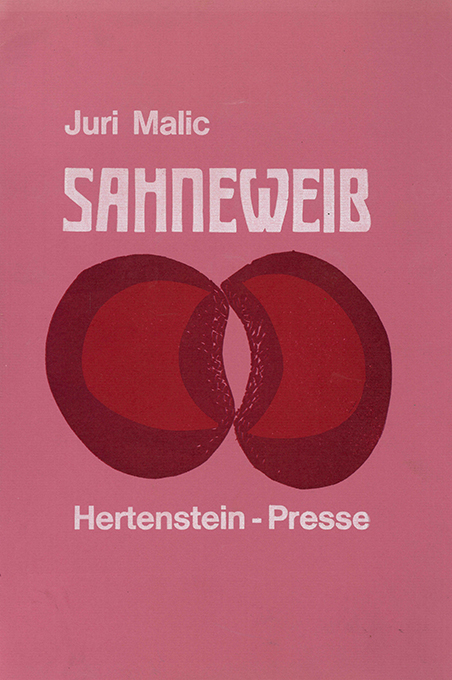 Hertenstein – Malic, Juri, Sahneweib. Mit 4 ganzseit. dreifarb. Orig.-Linolschnitten von Axel Hertenstein. Pforzheim, Hertenstein-Presse 1985. 25,5 x 38 cm. (20 S.), OKlappenkart. mit einem weiteren, zweifarb. Orig.-Linolschnitt (Rücken u. Rückdeckel am Rand verblasst, Kopfkapital etw. angeknickt u. leicht beschädigt). Sonst gutes Exemplar. Nicht bei Tiessen. Spindler 89.67. * Eins von nur 55 Exemplaren, vom Künstler nummeriert und signiert. – Der Text wurde aus großen Holzlettern gesetzt u. in Dunkelrot über einfarbige Linolschnitte in verschiedenen Rosa- u. Orangetönen gedruckt.