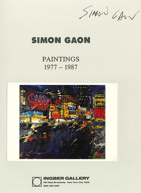 Gaon – Simon Gaon. Paintings 1977 – 1987. New York, Ingber Gallery 1988. 4°. 48 S. mit zahlr. (überwieg. ganzseit., teils farb.) Abbildungen, farb. illustr. OKt. Sehr gutes Exemplar. * Titelblatt von Gaon signiert u. mit lose mont. Farbpostkarte, welche rückseitig ebenfalls signiert wurde.