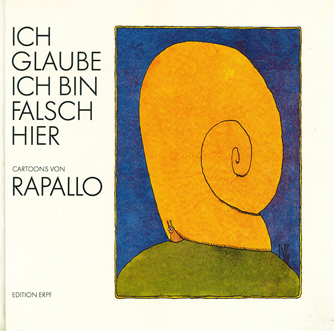 Cartoons – Rapallo, Ich glaube ich bin falsch hier. Bern u. München, Edition Erpf 1982. 26,5 x 26,5 cm. (64 S.) mit zahlr. (teils farb.) Cartoons, farb. illustr. OPp. (Buchblock, ein wenig zum Titel passend, falschherum eingehängt). Sonst gutes Exemplar. EA.
