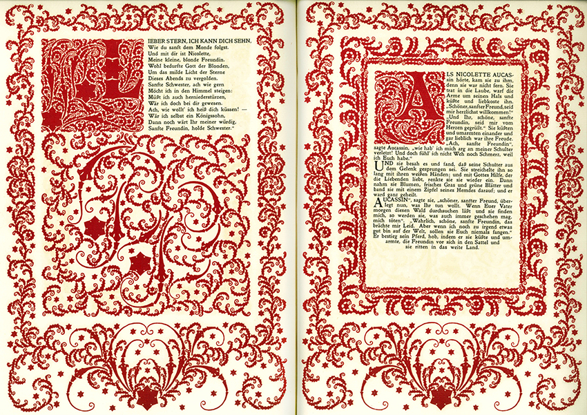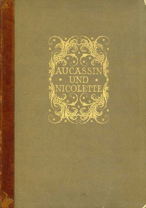 Avalun-Druck – Aucassin und Nicolette. Übertr. u. Nachwort von Erwin Rieger. Mit 30 (teils mehrfach verwendeten) großformatigen, ornamentalen Orig.-Holzschnitten von Rudolf Junk. (Hellerau), Avalun 1919. 1 Bl., (64 S.), 1 Bl., 1 beilieg. Bl. Nachwort, ornamental gemusterte Vorsätze, OHalblederbd. mit großer, goldgepr. Deckelvignette, Kopfgoldschnitt u. handgestochenen Kapitalen (das Leder mit Schabstellen, Ecken etw. bestoßen). Insges. gutes u. fleckenfreies, unbeschnittenes Exemplar. Rodenberg 331.4. * 4. Avalun-Druck. Eins von 380 (ges. 385) handschr. nummer. Exemplaren, von Rudolf Junk signiert. – Satz des Textes aus der Versacrum-Antiqua der Offizin der Universitätsbuchdruckerei Adolf Holzhausen, nach Satzanordnung des Künstlers auf handgeschöpftes Bütten gedruckt. Alle Seiten mit einfachen oder doppelten, ornamentalen Schmuckrahmen sowie großformatigen Schmuckinitialen, welche in Dunkelrot von den Stöcken gedruckt wurden, darin integriert der Text der altfranzösischen Dichtung. Druck auf der Handpresse, der Einband wurde in der Handbindewerkstatt von Carl Scheibe in Wien von Hand gebunden.