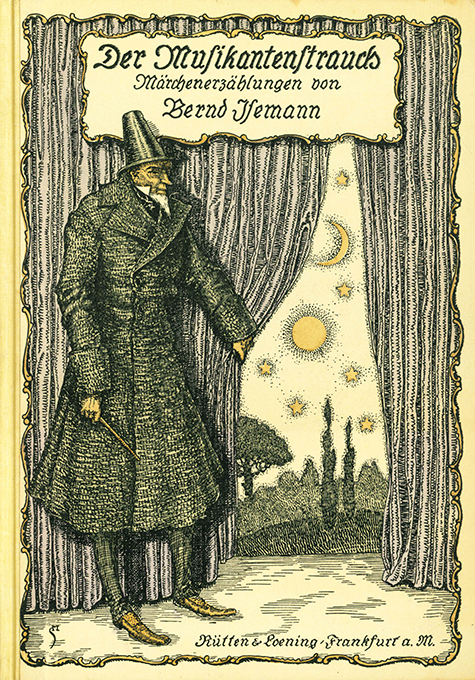 Schwerdtfeger – Isemann, Bernd, Der Musikantenstrauch. Märchenerzählungen. Mit 8 ganzseit. Zeichnungen von Max Schwerdtfeger. Frankfurt, Rütten & Loening 1914. Gr.-8°. 118, (2) S. + 8 Tafeln, OHalbpergamentbd. mit kolor. Deckelillustration u. Kopffarbschnitt. Mit Bauchbinde „Ein Märchenbuch für Erwachsene“, OPergamentpapierumschlag u. illustr. Schuber (dieser u. Umschlag nachgedunkelt u. mit kl. Randläsuren). Ansonsten absolut tadelloses, unbeschnittenes Exemplar. EA.