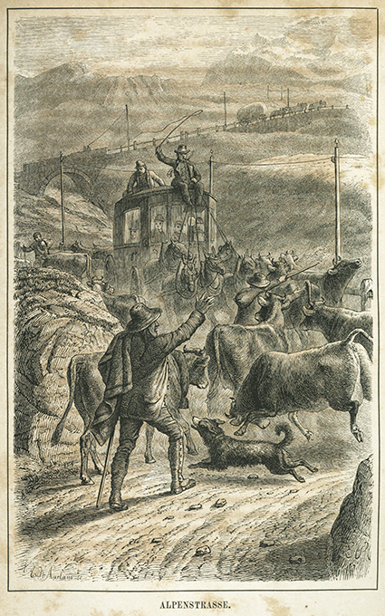 Berge – Alpen – Berlepsch, H(ermann) A(lexander von), Die Alpen in Natur- und Lebensbildern. Mit sechzehn Illustrationen nach Originalzeichnungen von Emil Rittmeyer. Leipzig, Costenoble 1862. 2. Aufl. 8, (2), XII, 392, 8, (4) S. + 16 Tafeln, gold- u. blindgepr. illustr. OLwd. (Gelenke außen u. innen beschädigt, Läsuren, Vorsätze beschädigt u. teils eingerissen, Namensstempel). Papier durchgehend nachgedunkelt u. stockfl., die Tafeln gebräunt bzw. braunfleckig. Insges. noch brauchbares Exemplar der frühen Ausgabe. * Kulturgeschichtlich bedeutendes Werk über den Alpenraum. Über die Berge, Wälder, Pflanzen, Alpenglühen, Sennenleben, Alphorn, den Geißbub, Jagd, Wildheuer, Dorfleben, Holzschläger u. Flößer, Alpstubeten oder Aelplerfest u.a. Berlepsch war Buchhändler u. Verleger. Nach Verfassen mehrerer Bücher u. Reiseführer über die Alpen u. die Schweiz war er auch Herausgeber der „Thüringer Zeitung“, schrieb für die „Gartenlaube“, war Hauptredakteur für die Reisebücher des Bibliographischen Instituts.