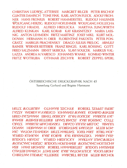 Österreichische Druckgraphik seit 45. Sammlung Gerhard und Brigitte Hartmann. Albstadt, Galerie Albstadt 1999. Gr.-8°. 79 S. mit zahlr. (teils farb.) Abbildungen, OKlappenkart. Sehr gutes Exemplar. EA. * Attersee, Frohner, Fronius, Hausner, Hrdlicka, Korab, Lassnig, Lehmden, Moldovan, Rainer, Rössing, Wotruba u.a.