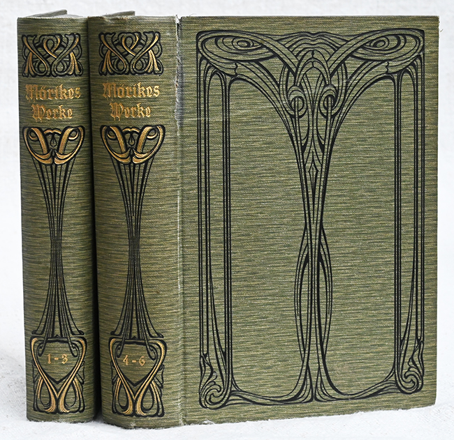 Mörike, Eduard, Sämtliche Werke in sechs Bänden (diese in 2 Bänden). Hrsg. von Rudolf Krauß. Mit sehr ausführl. Einführung „Mörikes Leben und Schaffen“. Mit vier Bildnissen, zwei Schattenrissen u. einem Briefe als Handschriftprobe. Neue, vermehrte Ausgabe. Leipzig, Hesse 1909. Kl.-8°. Zus. 1568 S., olivgrüne OLwdbde. mit Jugendstildekor, goldgepr. Rücken u. Ganzfarbschnitten (ein Gelenk über 3 cm eingerissen). Innendeckel mit Exlibris, sonst sehr gutes Exemplar.
