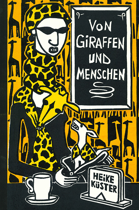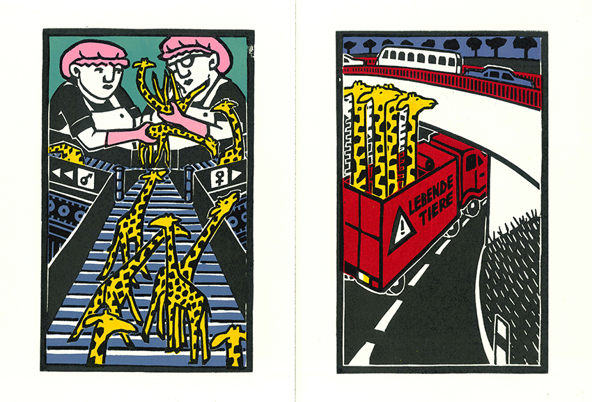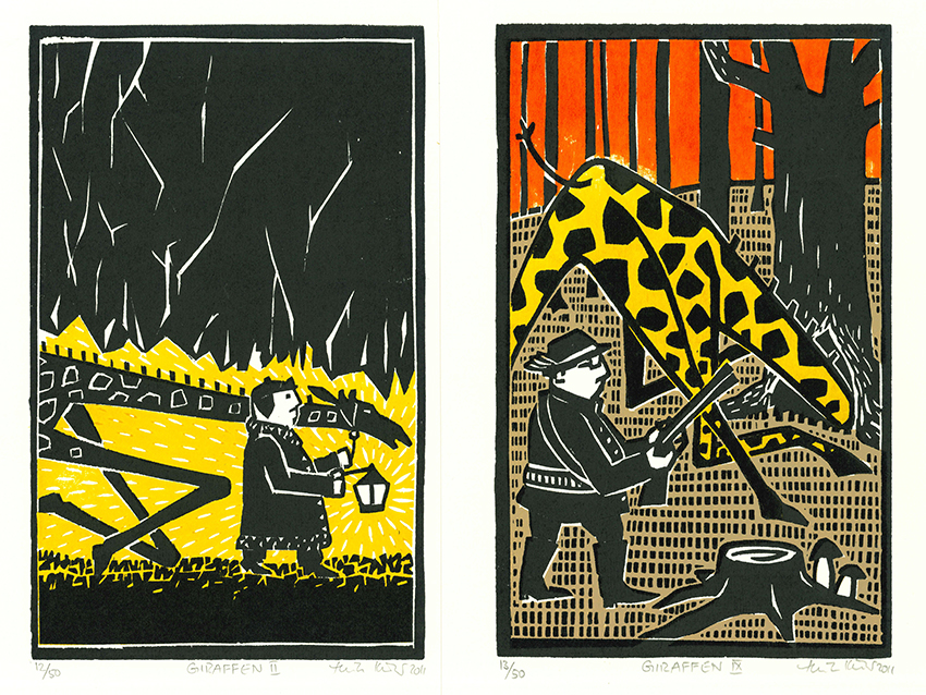 Junge Illustratoren – Küster, Heike, Von Giraffen und Menschen. Mit 25 (überwieg. ganzseit. farb.) Orig.-Holzschnitten. Wenzendorf, Privatdruck Küster 2012. 22,5 x 33 cm. (34 S.), OHlwd. mit Farbholzschnitten auf Vorder- u. Rückdeckel. Sehr gutes Exemplar. EA. * Eins von 100 nummer. Exemplaren, im Druckvermerk von der Künstlerin signiert u. datiert. Beiliegen in einem mit einer Holzschnittvignette versehenen Papierumschlag 2 zusätzliche (davon 1 farb. u. 1 zweifarb.) Orig.-Holzschnitte, nummeriert (jeweils 1 von 50 Exemplaren), betitelt „Giraffen II“ u. „Giraffen IX“, signiert u. datiert (2011). – Text u. Graphiken stammen von Heike Küster; auch die Texte wurden in Holz geschnitten u. negativ von den Stöcken gedruckt.