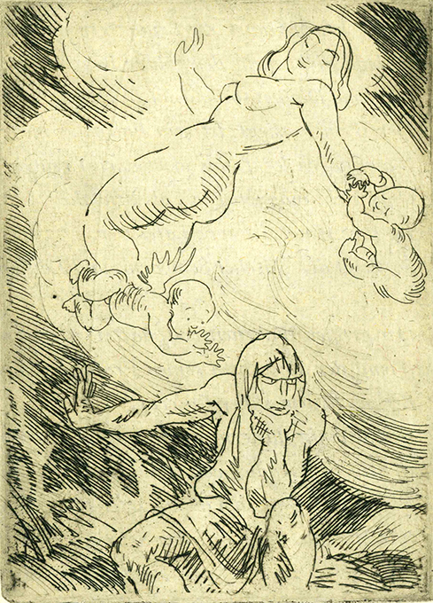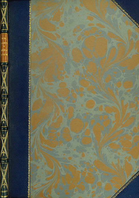 Wieland, Christoph Martin, Musarion oder Die Philosphie der Grazien. Ein Gedicht in drey Büchern. Mit 12 Orig.-Radierungen von Hans Gött. München, Drei Masken Verlag (1924). 19 x 28 cm. 1 Bl., 72, (4) S., 1 Bl., OHalblederbd. (die Bünde nur minim. berieben). Praktisch tadelloses Exemplar mit unbedrucktem Papierumschlag u. Schuber (beide stellenw. nachgedunkelt u. mit Läsuren). Rodenberg 448.9. * 9. Obelisk-Druck. Eins von 250 (ges. 340) nummer. Exemplaren der Normalausgabe, im Druckvermerk von Hans Gött signiert. In einem schönen Handeinband (sign. Hübel & Denck, Leipzig): nachtblauer Halbfranzband auf 5 echten Bünden, mit Lederecken, Goldpr., goldgepr. Lederrückenschild u. Kopfgoldschnitt. Wielands Verse wurden aus der Walbaum Antiqua u. Kursiv gesetzt u. auf geripptes Bütten gedruckt.