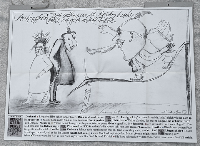 Kauert – Diekert, Michel, Zwischen den Pappdeckeln. Bruchsteinverse. Zeichnung: Linde Kauert. Kalligraphie / Gestaltung: Heinz Hellmis. (Potsdam), Edition Zwiefach (ca. 2011). Einblattdruck (58,5 x 42 cm), gefalzt u. zwischen zwei Pappdeckel montiert, mit einer Schnur verschlossen. In äußerst kleiner Auflage erschienen.