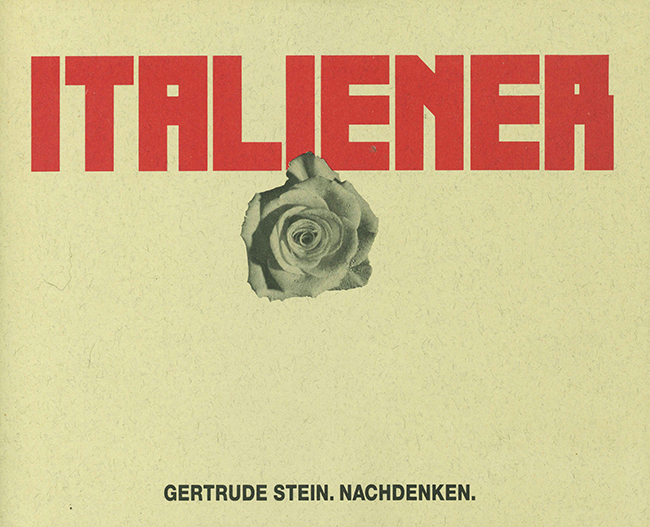 Stein, G. – Hänsel, Andreas, Gertrude Stein. Nachdenken. Zur Produktion „Italiener“ von Gertrude Stein des Theater Erlangen 1990. 21 x 17 cm (quer). (28 S.) mit Abbildungen u. 1 mont. Farbbild, OBrosch. mit illustr. OUmschl. Gutes Exemplar. Selten.