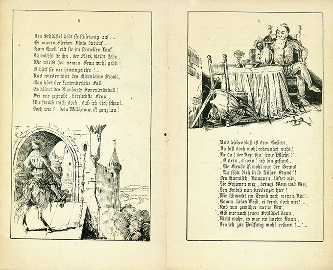 Pocci, F(ranz) – Blaubart. Ein Märchen, erzählt u. gezeichnet von F. Pocci. München, Buchhandlung Christian Kaiser (1846; 2. Aufl.) 16 S. mit 16 Zeichnungen, OBrosch. mit 2 weit. Zeichnungen auf Vorder- u. Rückdeckel (stellenw. nachgedunkelt, Rückenfalz stellenw. eingerissen). Das Textpapier nur minim. nachgedunkelt. Insges. gutes u. frisches Exemplar. * Titelauflage der 1845 in München bei Zach erschienenen, praktisch unauffindbaren Erstausgabe. Poccis schöne Illustrationen zu seinem in Versen geschriebenen Märchen wurden als Lithographien gedruckt.