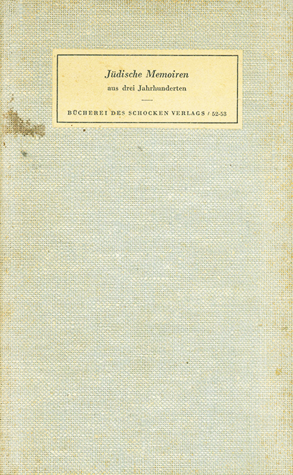 Jüdische Memoiren aus drei Jahrhunderten. Ausgewählt u. hrsg. von Hans Bach. (= Bücherei des Schocken Verlags 52-53). Berlin, Schocken / Jüdischer Buchverlag 1936. 209, (11) S., OLwd. (etw. nachgedunkelt, Rücken gebräunt, Vorderdeckel mit einem dunkelbraunen Fleck, Schnitt etw. fleckig u. mit teils in die Blattränder reichenden Schabspuren). Insges. wohlerhalten. EA. * Glückel von Hameln, Aron Isak, Henriette Herz, Moritz Oppenheim, Berthold Auerbach, Therese Devrient, Julius Rosenberg, Moritz Lazarus u.a.
