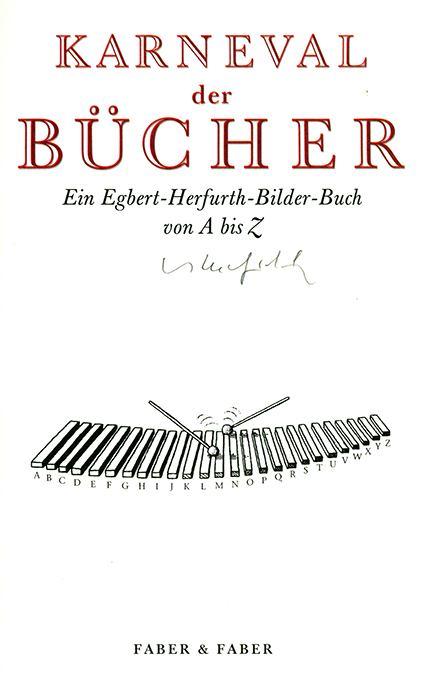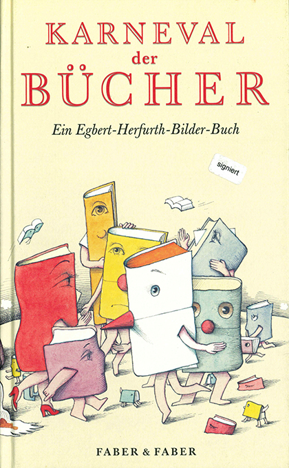 Herfurth – Karneval der Bücher. Ein Egbert-Herfurth-Bilder-Buch (signiert). Vorwort von Elmar Faber. Leipzig, Faber & Faber 2004. Gr.-8°. 141, (3) S. mit zahlr. (teils ganzseit., teils farb.) Abbildungen, illustr. Vorsätze, farb. illustr. OPp. EA. * Dieses Exemplar von Herfurth auf dem Titelblatt signiert. – „Am Anfang war das Wort, hieß es in einer geheiligten Schrift, aber nun sehen wir, am Ende war das Buch, der Quell unserer nobelsten Phantasie. Herfurths ‚perpetuum libri‘ streichelt liebevoll, ironisch, zweifelnd und optimistisch diese Welterfahrung.“ (Vorwort)
