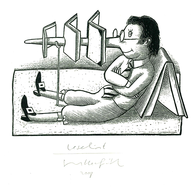 Herfurth – Walther, Klaus, Was soll man lesen? Ein Leseverführer. Leipzig, Faber & Faber 2005. 218, (6) S. mit Abbildungen aus „Der Zwiebelfisch“ u. „Der Bücherwurm“, ill. OPp. mit farb. illustr. OUmschl. Tadelloses Exemplar in (etwas angestaubtem) Schuber. EA. * Im Buch nicht genannte Vorzugsausgabe mit einem beilieg. Orig.-Acrylstich von Egbert Herfurth, eigenhänd. betitel „Leselust“, signiert u. datiert.