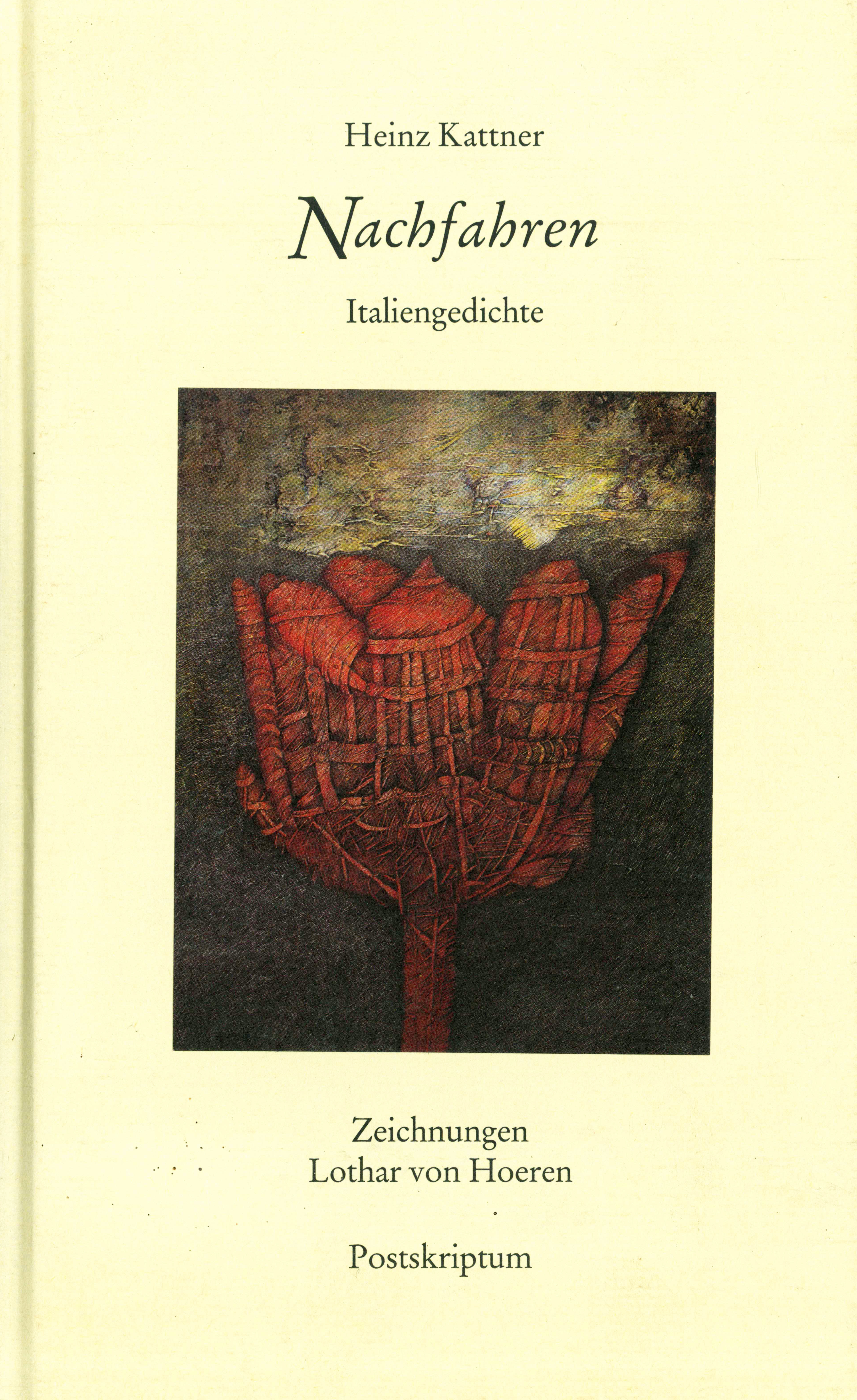 Kattner, Heinz, Nachfahren. Italiengedichte. Mit 2 ganzseit. farb. Zeichnungen von Lothar von Hoeren. Hannover, Postscriptum 1995. 4°. 47 S., farb. illustr. OPp. (einige winz. Sprenkelchen). Sonst tadellos. EA. * Eins von 550 (hier nicht nummer.) Exemplaren, im Druckvermerk (nur) von Heinz Kattner signiert. Vortitelblatt mit schöner zehnzeil. eigenhänd. Widmung des Dichters.