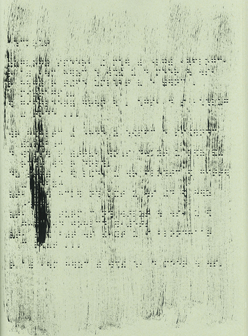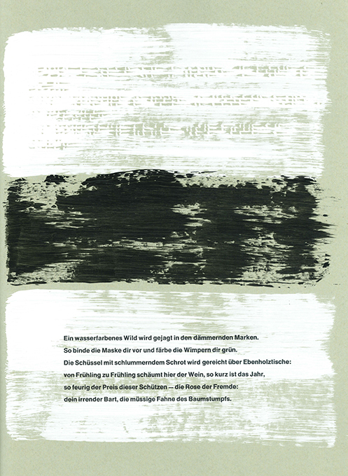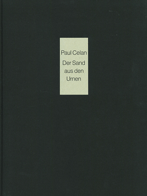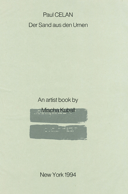 Kaldewey Press – Celan, Paul, Der Sand aus den Urnen. An artist book by Mischa Kuball. New York 1994. 27,5 x 37,5 cm. (62 S.) u. 2 Bl. auf Pergamentpapier (Titelblatt u. Colophon), handgebund. anthrazitfarbener OPappbd. mit Deckelschild. Makelloses Exemplar in einer Pappmappe (diese mit 1 winz. Läsur) u. Schuber. Von Lucius 209. Kat. WLB Stuttgart 47. * 22. Druck der Edition Gunnar A. Kaldewey. Eins von 50 (ges. 65) Exemplaren der Normalausgabe, vom Künstler signiert. – Der Band enthält 13 Orig.-Acrylübermalungen sowie Celans Texte auf kräftigem, hellgrauen Papier über Blindprägungen – eine zusätzliche Wiedergabe der Texte neben dem Buchdruck in Braille-Schrift (Blindenschrift). – Es handelt sich um den zweiten Band des Kaldeweyschen Celanprojektes von „Mohn und Gedächtnis“, gedruckt im „Tower of Poestenkill“, New York. Die Handeinbände schuf Craig Jensen.