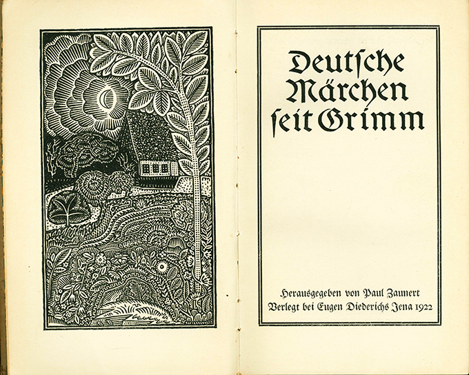 Deutsche Märchen seit Grimm. Hrsg. von Paul Zaunert. (= Die Märchen der Weltliteratur, hrsg. von Fr.v.d. Leyen u. Paul Zaunert). Zwei Bände. Jena, Diederichs 1922. 414, (6) u. 303, (5) S.mit Frontispizillustrationen u. zahlr. Vignetten von H. F. E. (sic) Schneidler, OHalblederbde. mit Goldpr. (etw. berieben, Rücken von Bd. I mit stärkeren Läsuren u. Randfehlstellen, Vorderdeckel dieses Bandes mit hellen Flecken). Sonst / innen wohlerhalten. Bd. I liegt als 22.-27. Tsd. vor, Bd. II in 1. Auflage.