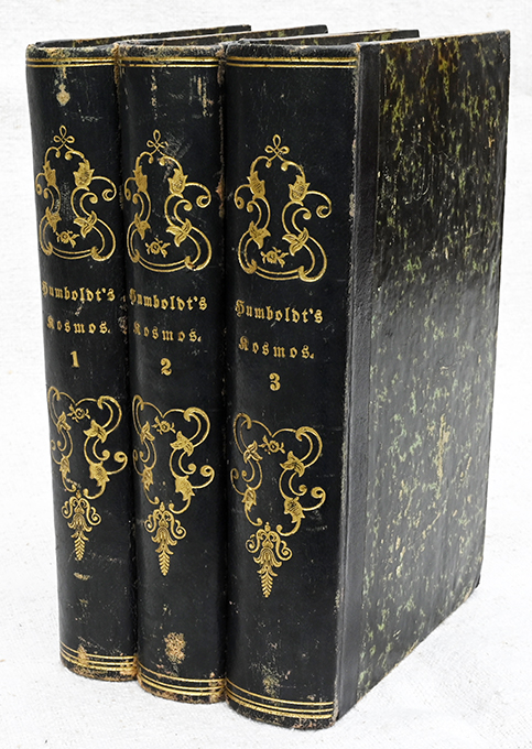 Humboldt, Alexander von, Kosmos. Entwurf einer physischen Weltbeschreibung. Bände I – III. Stuttgart u. Tübingen, Cotta 1845 – 1858. XVI, 494, 544 u. 644, (2) S., Halblederbde. der Zeit mit goldgepr. Rücken (etw. berieben, ein Kopfschnitt etw. feuchtigkeitsfleckig, Vorsätze leimschattig u. mit jeweils einem alten Besitzstempel). Papier stockfleckig. Insges. wohlerhalten. EA. * Die Bände sind in sich geschlossen. In den Jahren 1858 u. 1862 folgten zwei weitere Bände, die hier nicht vorliegen.