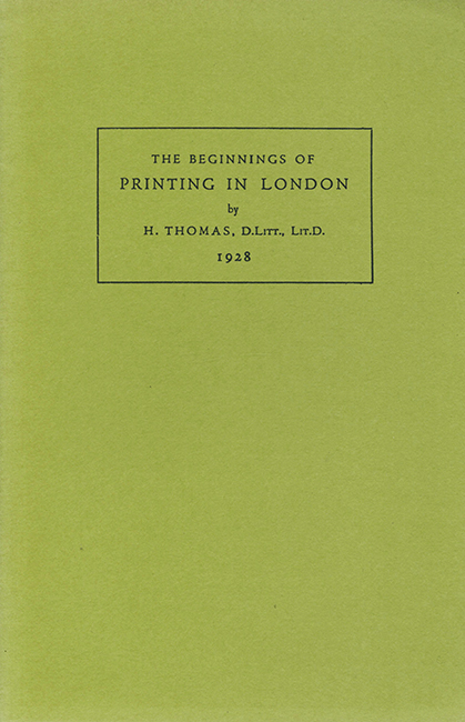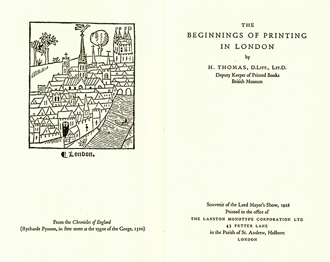 Morison – Thomas, H., The Beginnings of Printing in London. Souvenir of the Lord Mayor’s Show. Faksimilenachdruck der Erstausgabe, London 1928. Ravenswood, Tony Appleton 1980. 1 Bl., 15, (3) S. mit 4 Holzschnitten, OBüttenbrosch. (eine Ecke minim. angeknickt). Nahezu tadellos. * Eins von nummer. 100 Exemplaren, dieses mit eigenhänd. Widmung des Herausgebers: „Number Fifty-seven for E. Schumacher-Gebler from Tony Appleton“. Schöner Druck auf Bütten. – Die Vorlage wurde von Stanley Morison gestaltet u. von The Lanston Monotype Corporation gedruckt.