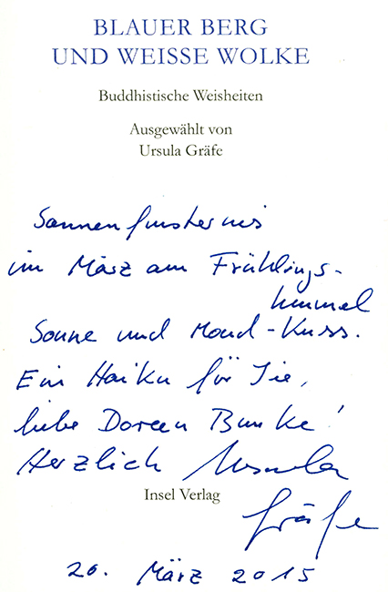 Insel-Bücherei 2506 – Blauer Berg und weiße Wolke. Buddhistische Weisheiten. Ausgewählt u. mit editor. Notiz von Ursula Gräfe. (= Insel-Bücherei 2506). Berlin, Insel 2015. 9,7 x 15 cm (IB-Kleinformat). 83, (5) S., farb. illustr. OPp. Sehr gutes Exemplar. 1. Auflage. * Titelblatt mit einem eigenhänd. Haiku u. datierter Widmung von Ursula Gräfe (insges. 9 Zeilen).