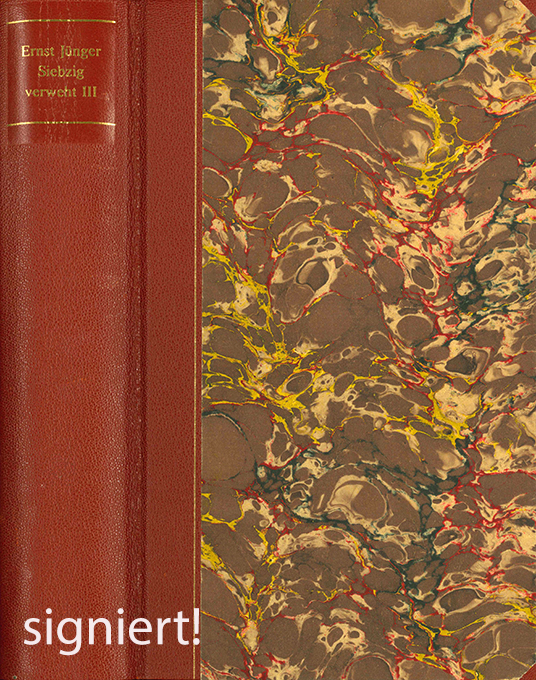 Jünger, Ernst, Siebzig verweht III. Stuttgart, Klett-Cotta 1993. 594, (2) S., OHalblederbd. mit goldgepr. Rückentitel u. marmor. Überzugspapier. Gutes Exemplar. EA. * Eins von 300 nummer. Exemplaren der Vorzugsausgabe, in Halbleder gebunden u. vom Autor signiert.